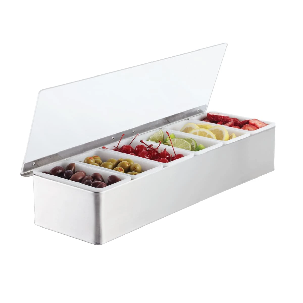 This condiment dispenser has 6 compartments for olives, lemons, limes, oranges, and more. The sanitary plastic containers fit inside stainless steel base and a clear lid helps keep the condiments fresh.