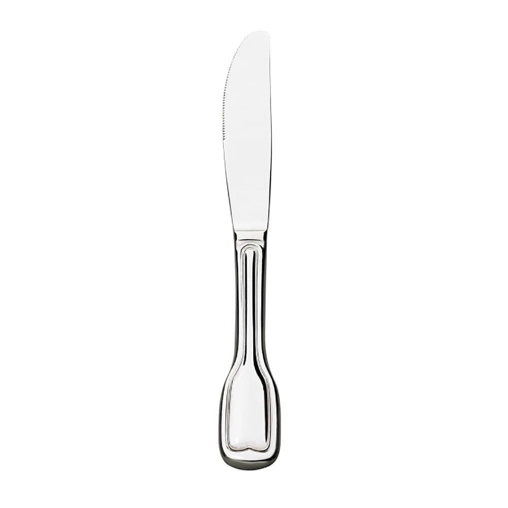 The Lafayette Flatware Collection from Browne Foodservice features a warm, silver-like appearance with a square shape and curved detailing on the handle.