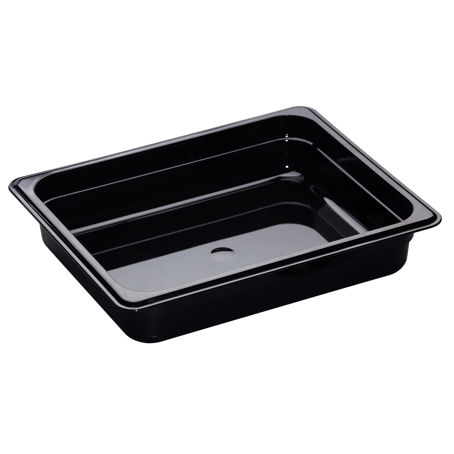 For going from prep to cooler to oven to steam table with just one pan, use this black, 2‐1/2″ high half size H‐Pan™ made of durable, heat‐resistant plastic. This high heat food pan withstands temperatures from ‐40°F all the way up to 375°F, making it perfect for flash freezing, cooking and reheating; you can use it with steam tables, chafing dishes and more. The smooth, non‐stick interior makes cleaning easy, and also helps the pan stack neatly without sticking.