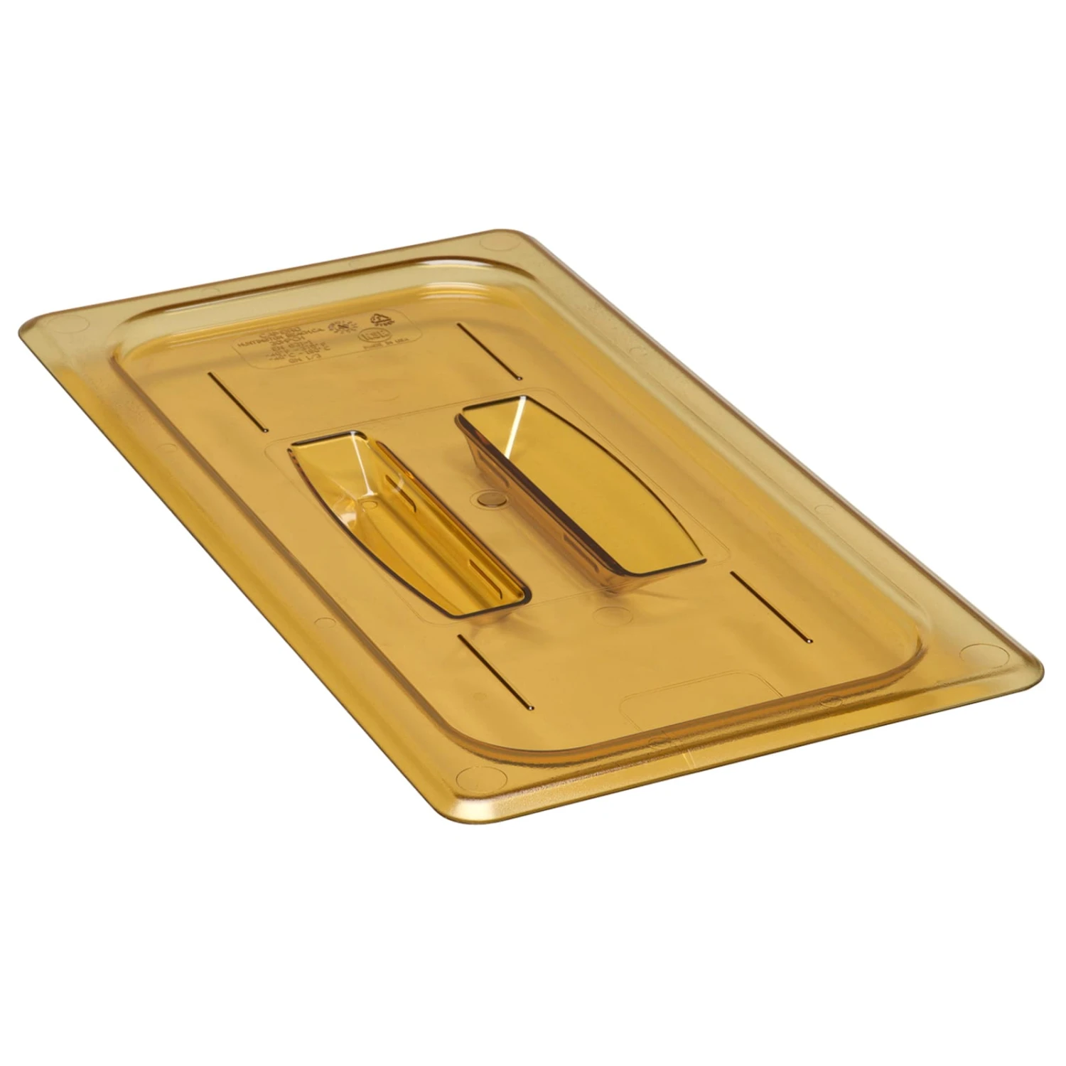 Use this amber, 1/3 size H‐Pan™ cover with handle to keep the contents of your pans secure and prevent cross‐contamination. The high heat material withstands temperatures from ‐40°F all the way up to 375°F, making it perfect for flash freezing, cooking and reheating; you can use it with microwaves, steam tables, chafing dishes and more.