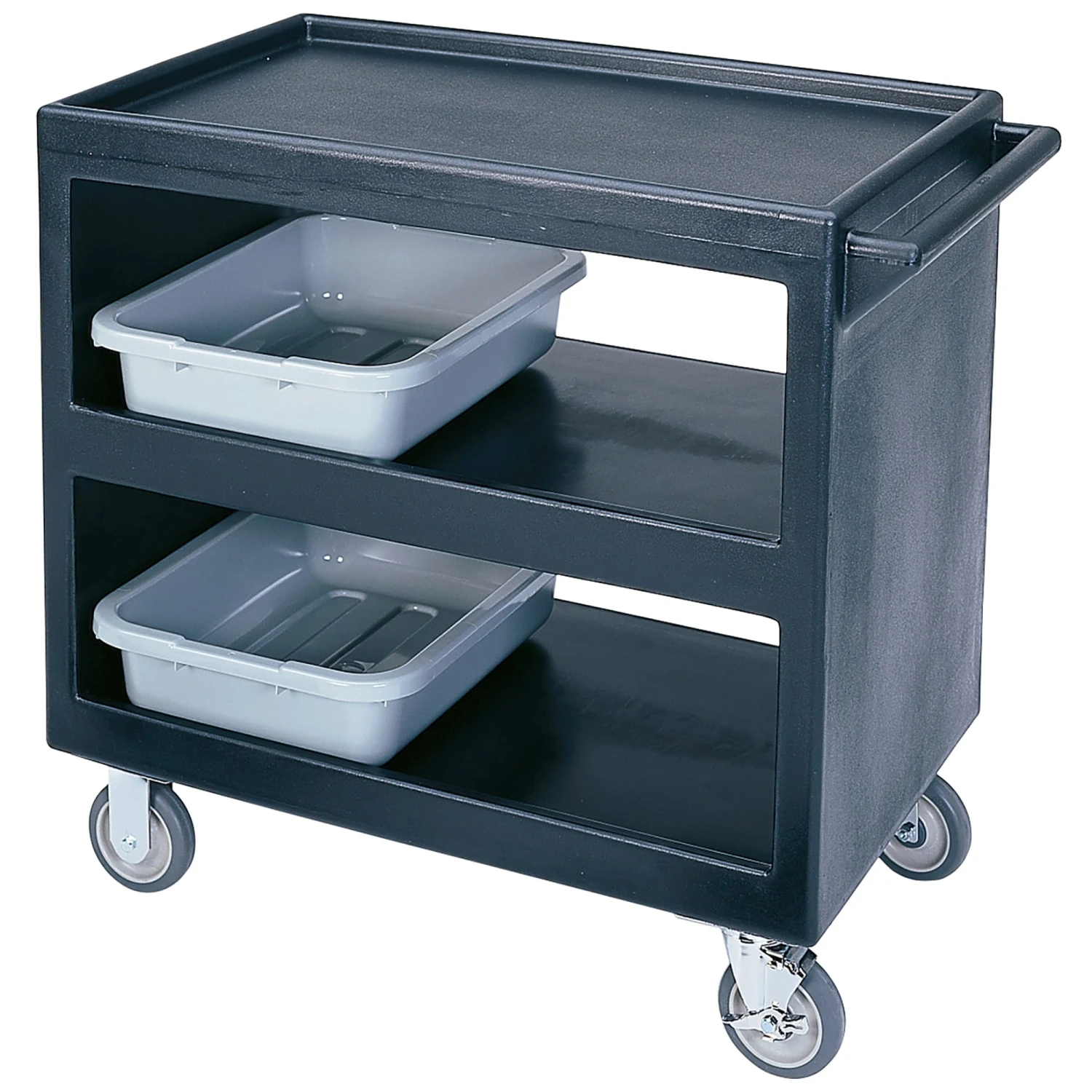 This versatile, black service cart is right at home in the dining room, stock room or loading dock; you can use it for bussing, materials transport, or just about anything else. The open‐sided, one‐piece design has molded in shelves and handles that can’t accidentally break off, and the whole cart is constructed of highly durable polyethylene.