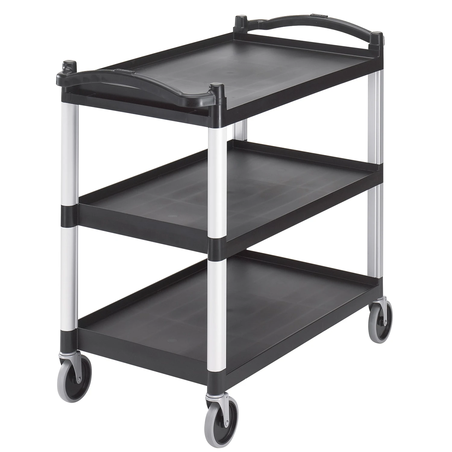 This black 3‐shelf utility cart is made of durable, economical polypropylene and holds up to 400 pounds, with one full size dish rack or two standard bus boxes fitting side by side on each shelf. The aluminum uprights ensure stability and the 5″ swivel casters are quiet and non‐marking. This cart is shipped knocked down to minimize shipping costs. Optional accessories available are a single shelf panel set, a removable 8 gallon trash container and 2.5 gallon silverware holder. Shelf panels must be added at time of assembly.