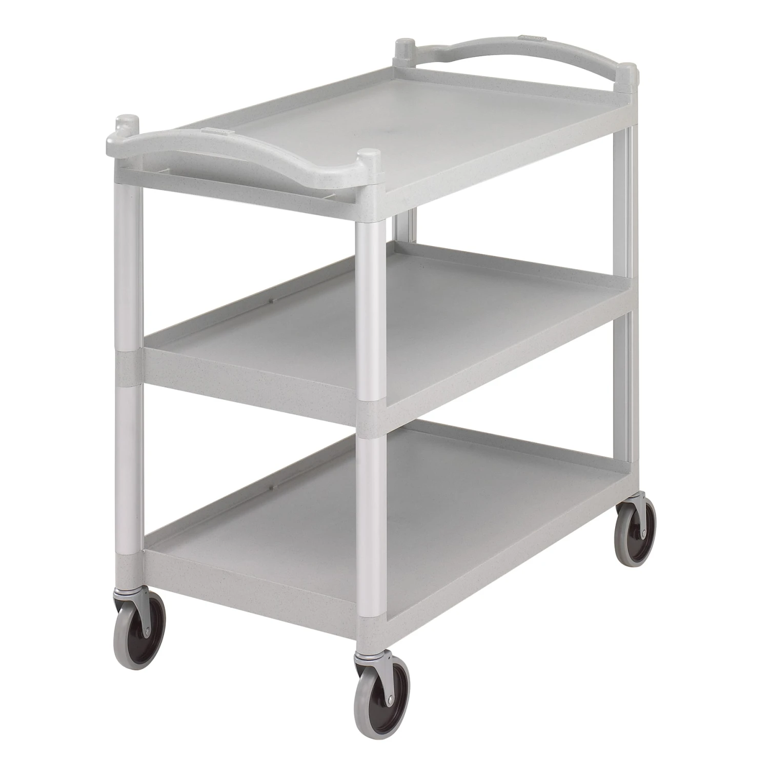 This 3‐shelf utility cart is made of durable, economical polypropylene and holds up to 400 lbs., with one full size dish rack or two standard bus boxes fitting side by side on each shelf. The aluminum uprights ensure stability and the 5″ swivel casters are quiet and non‐marking. This cart is shipped knocked down to minimize shipping costs. Optional accessories available are a single shelf panel set, a removable 8 gallon trash container and 2.5 gallon silverware holder. Shelf panels must be added at time of assembly.