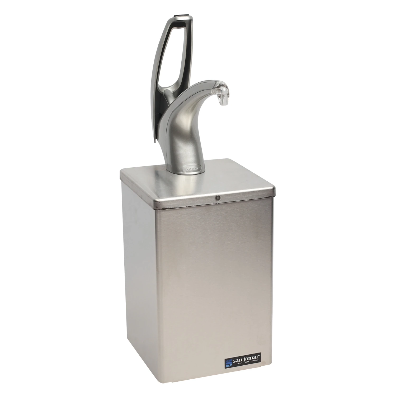 This San Jamar® FrontLine™ Countertop Box System Condiment includes a Soft Touch™ Pump that delivers consistent 1 Ounce portions and can dispense condiments, sauces, and dressings. This system dispenses 1 Gallon jar, #10 can, #10 jar, or direct pour and has a sleek, low-profile design. It is ideal for quick-serve restaurants and concession areas.