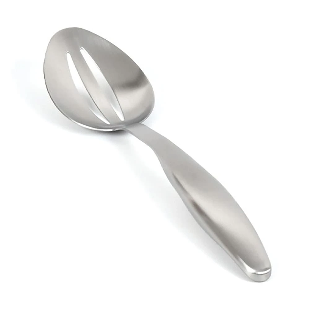 This stainless steel serving spoon from Front Of The House is 10.25″ long and features a beautiful brushed finish.