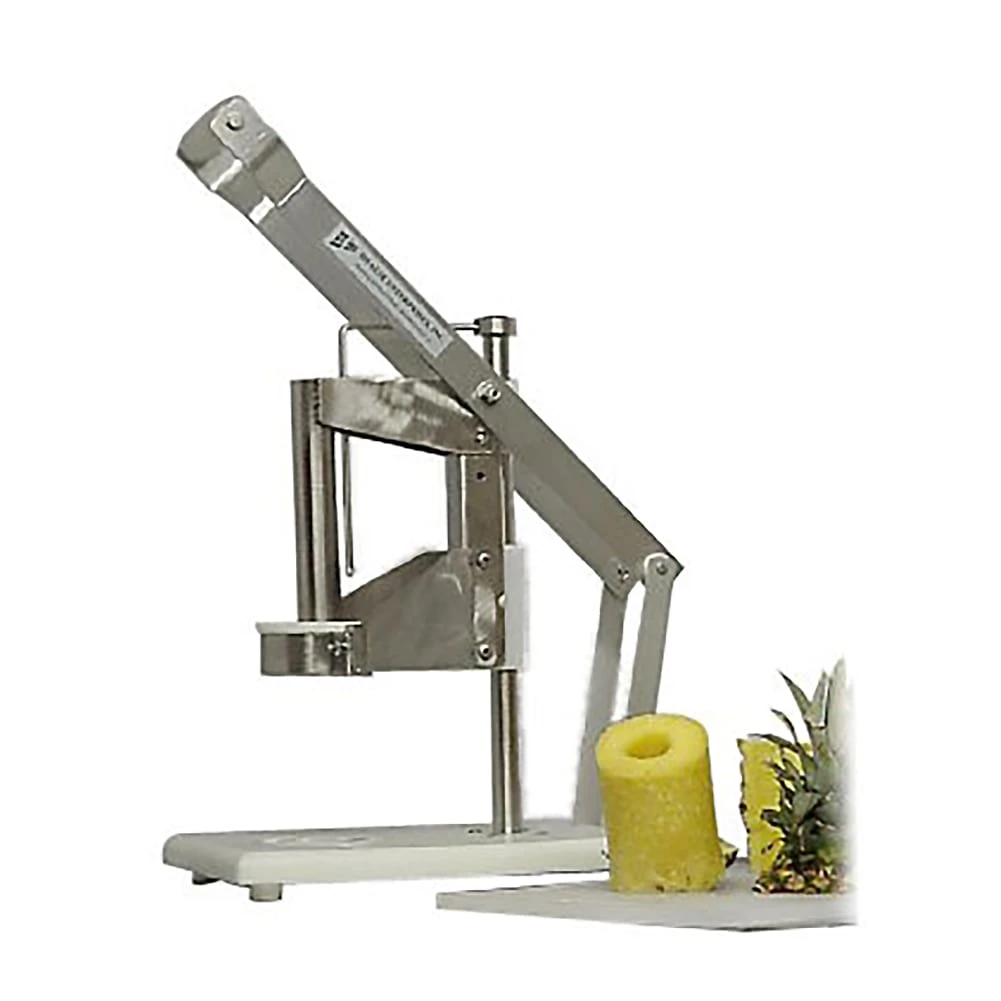 The E-Zcut II freestanding pineapple peeling & coring machine manufactured by Healix Enterprises Inc. Plastic lug is used to catch the peel, core and juice of the peeled and cored pineapple. This machine uses a 84mm blade with a 1.25″ core tube, also uses a friction system on all pivit points to allow the handle to stay in the up position. That machine also uses a 2 handed handle, a tether and push rod for the last core, a upgraded suction cup on the base.
