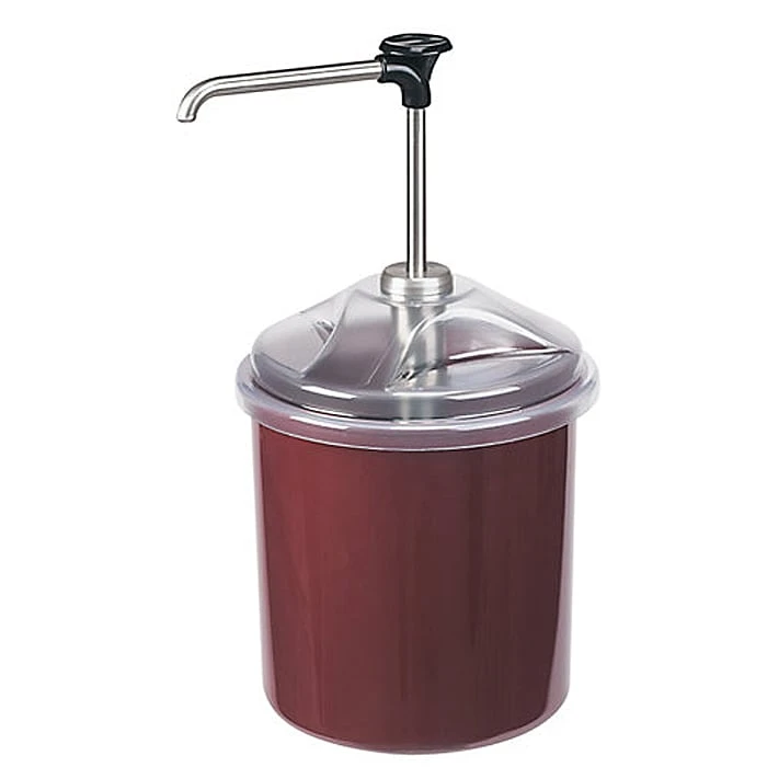 Make purchasing consumable bottle pumps a thing of the past. This (mostly) stainless steel pump has been completely redesigned to dispense smooth condiments, directly from a standard 2.7 Qt. (2.6 L) salad crock. A clear, plastic lid allows for fast monitoring of your product level while the pump takes care of portion control and eliminates the mess of ladling. Additional uses include: a station of ranch and BBQ for wing program, cocktail sauce, and the smooth, specialty sauces on your sandwich prep table.
