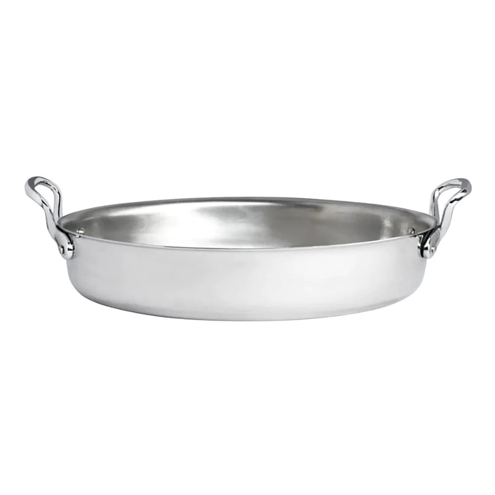 This 3 quart oval induction pan features a beautiful mirror finish with chrome loop handles.