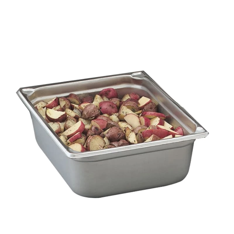 This 6 quart heavy duty stainless steel pan is perfect for transporting and stacking foods securely.