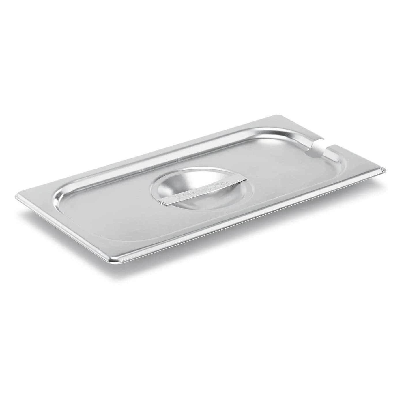 This Vollrath® 1/3 size slotted cover is made of durable stainless steel and features reinforced edges, which stays flat and fits securely to prevent product loss. This cover is meant for use with the 1/3 size Super Pan V®. It is made in the USA.