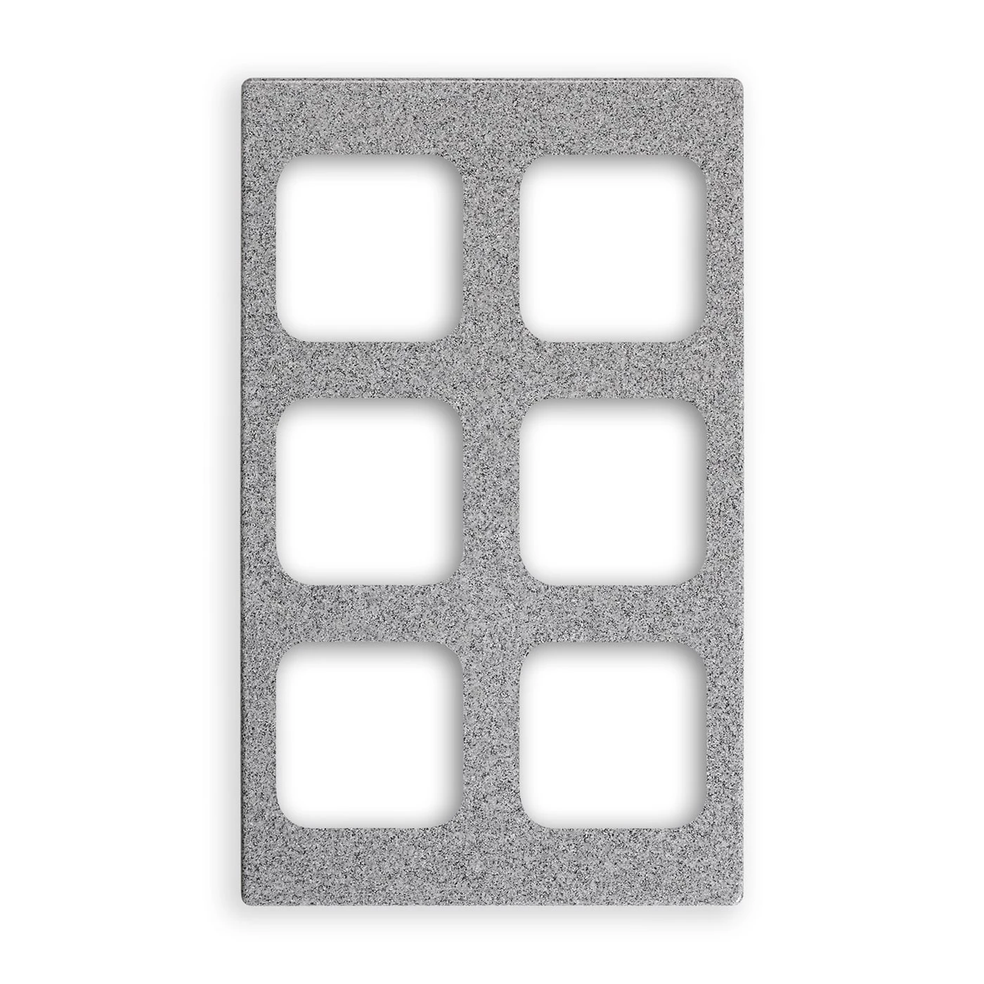 This Miramar® template from Vollrath® features durable FDA approved thermoset resin construction that is ideal for hot or hold applications. It also features a gray granite color and the pattern minimizes the appearance of wear. This template has six square cutouts and accommodates six 40003 pans.