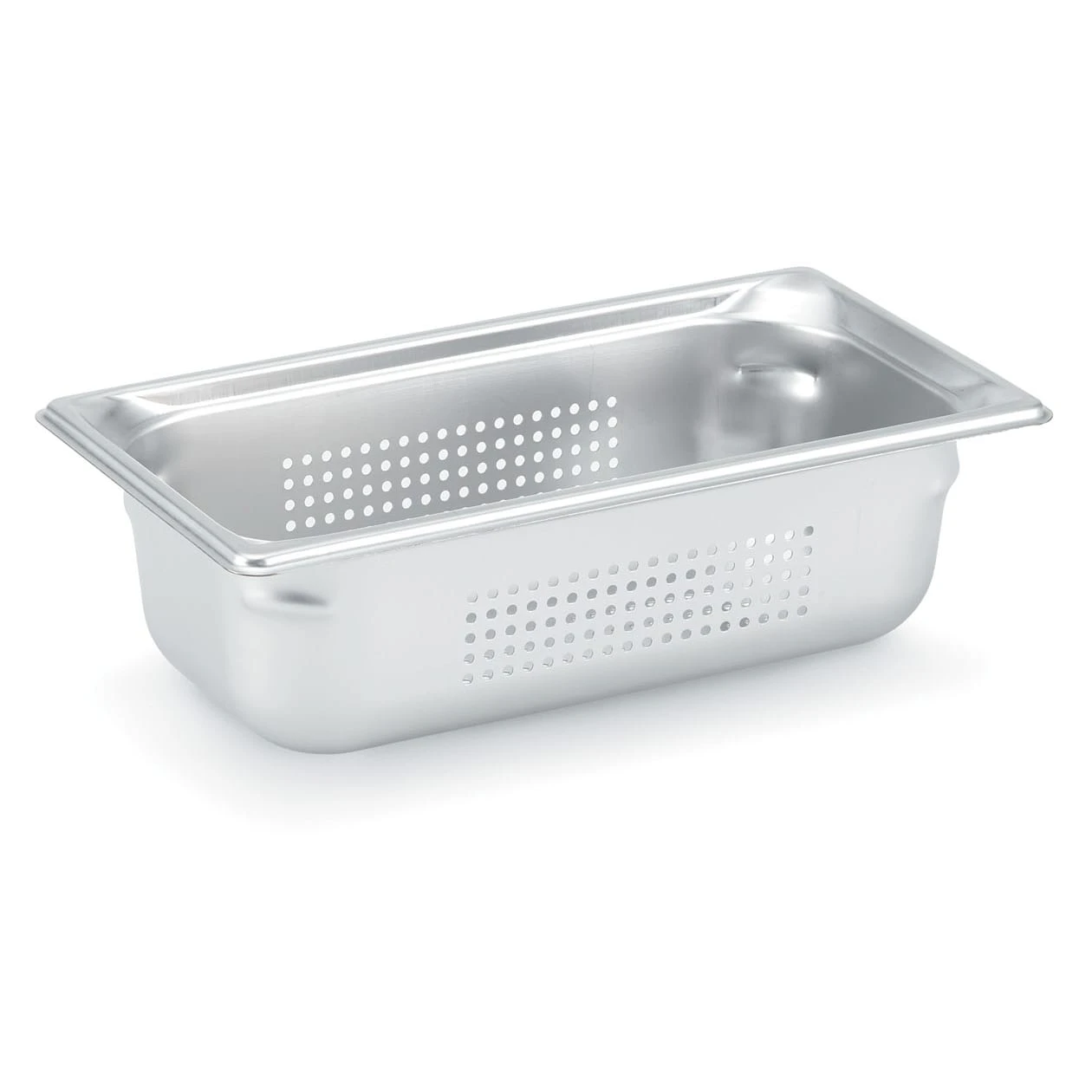 The 5/32 inch holes in the sides and bottom of this Super Pan Stainless Steel Pan are just the right size to drain off all liquids without losing any food. The durable 300 series stainless steel construction will help this pan to be in service for you for a very long time.