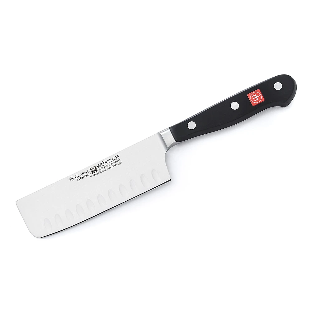 The Classic 5″ Hollow Edge Santoku Knife has a thinner blade that the chef’ knife and gradually curves up at the very end providing a straighter edge. This knife allows cooks to effortlessly prep a wide array of fresh produce, including starchy vegetables like potatoes, which tend to stick to a knife’s blade.