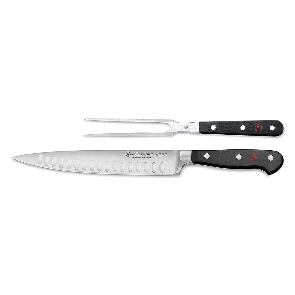 This 2 piece carving set from Wusthof‐Trident is part of the Classic Collection and includes an 8″ carving knife and a 6″ straight meat fork. The blades are constructed of high‐carbon stainless steel and is perfect for the larger cuts of meat.
